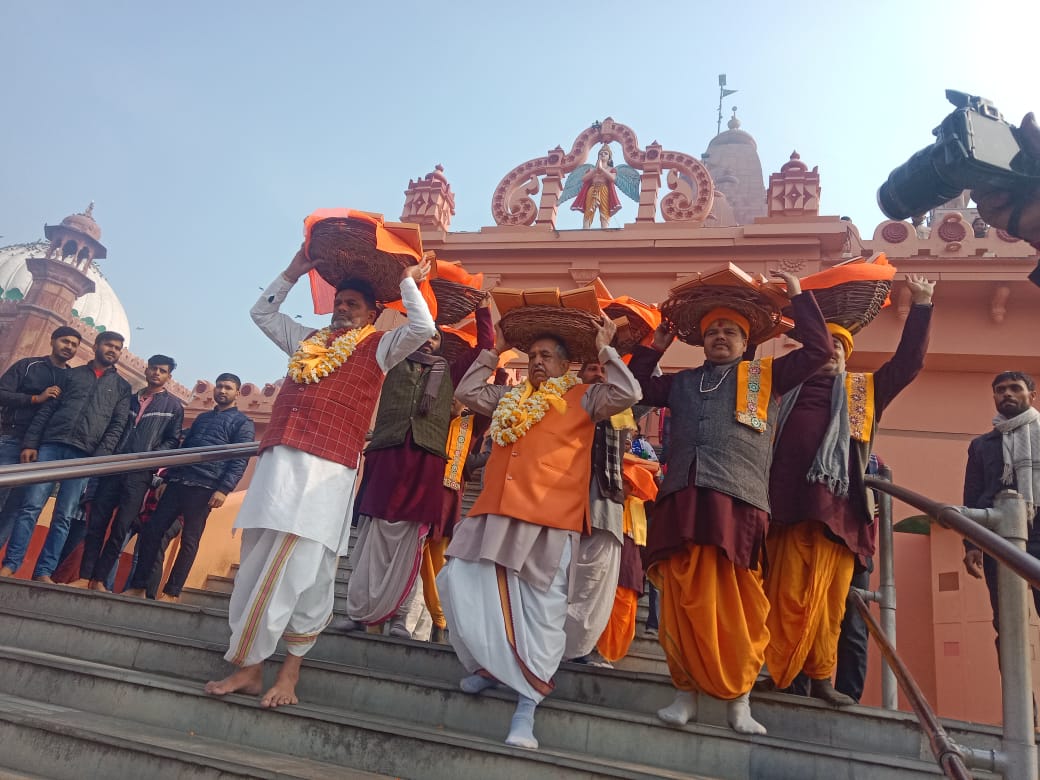,मथुराः रामनाम के सराबोर श्रीकृष्ण जन्मभूमि मंदिर कर परिसर। लड्डू गोपाल का आंगन में मंद हुआ श्रीराधे राधे, जय श्रीकृष्णा का जयघोष। हर ओर गूंजते जय श्रीराम, जय सियाराम के गगन भेदी स्वर। मृदंग पर सुध-बुध खोकर नृत्य कर झूमते भक्त। रामनाम रंग में रंग श्रीकृष्ण की जन्मभूमि। केशवदेव के भोग भंडार में विधि-विधान से पंच मेवा से तैयार हुए लड्डूओं से भरी छबरिया सिर पर रखकर भागवत भवन की सीढ़ियों से लाते श्रीकृष्ण जन्मस्थान सेवा संस्थान के सचिव कपिल शर्मा, सदस्य गोपेश्वर नाथ चतुर्वेदी और उनके संग में सेवायत। इन्ही लड्डुओं से लगेगा अयोध्या में रामलला का भोग।