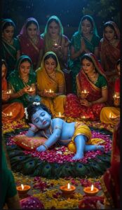 भादौ की नौमी को धीरे धीरे पौ फट रही थी, ग्वालिनें खिरकन की ओर गायों को चारा दाना खिलाने और दुहाने के लिए जा रही थी। गलियों में एक दूसरे से मिली और कहने लगी कि यशोदा ने लल्ला जायौ है।