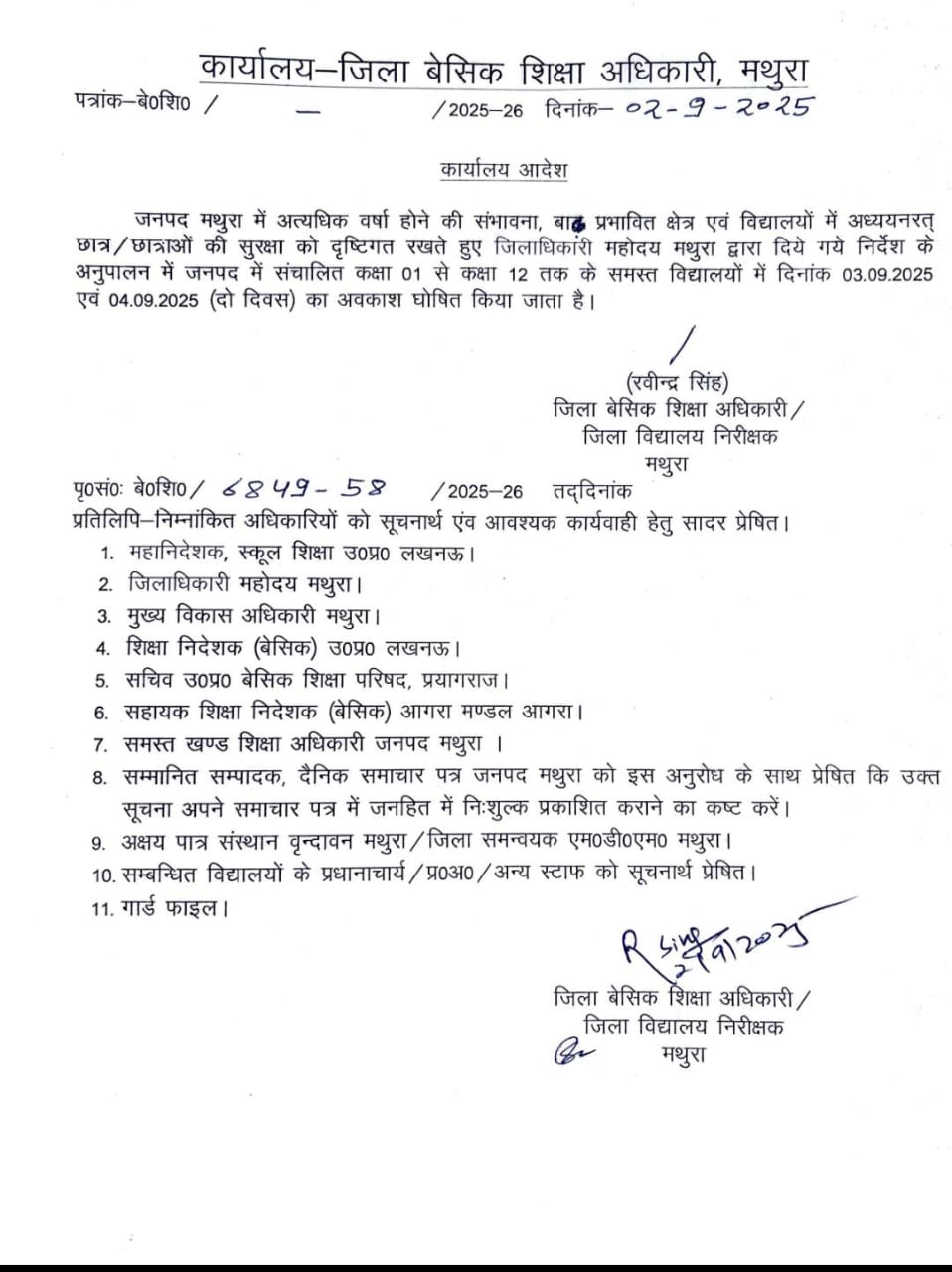 मथुरा 2 सितंबर 2025 : अत्यधिक वर्षा और बाढ़ के मद्देनजर कक्षा एक से 12 वीं तक के स्कूल बंद कर दिए गए हैं। मंगलवार रात डीएम के निर्देश पर बीएसए ने तीन और चार सितम्बर के अवकाश के आदेश जारी किए हैं। इधर, अपर जिलाधिकारी वित्त एवं राजस्व पंकज कुमार वर्मा ने अवगत कराया है कि