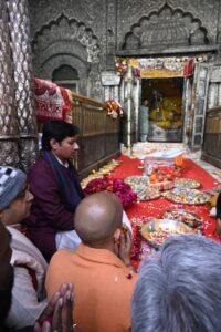 मंदिर पहुंचने पर सेवायतों ने परंपरागत रीति से स्वागत किया। मुख्यमंत्री और राष्ट्रीय अध्यक्ष ने ठाकुर बांके बिहारी के चरणों में शीश झुकाया, दीप प्रज्ज्वलित किया, पुष्प अर्पित किए और इत्र सेवा की। पूजा-अर्चना वैदिक मंत्रोच्चार के बीच संपन्न कराई गई।